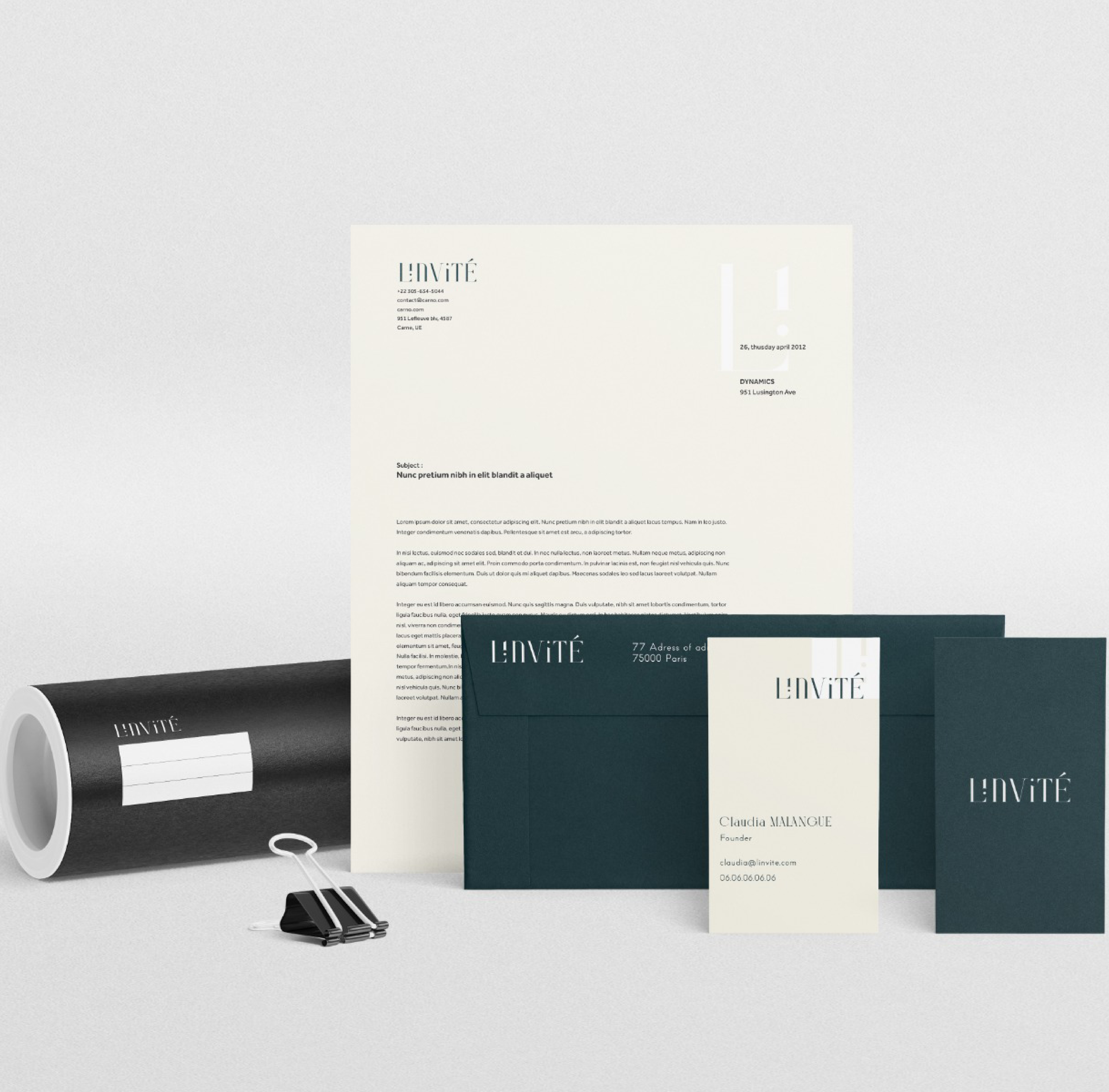 Conception de l’identité visuelle de L’Invité, marque pensée autour de l’accueil, de la relation et du soin porté aux détails.